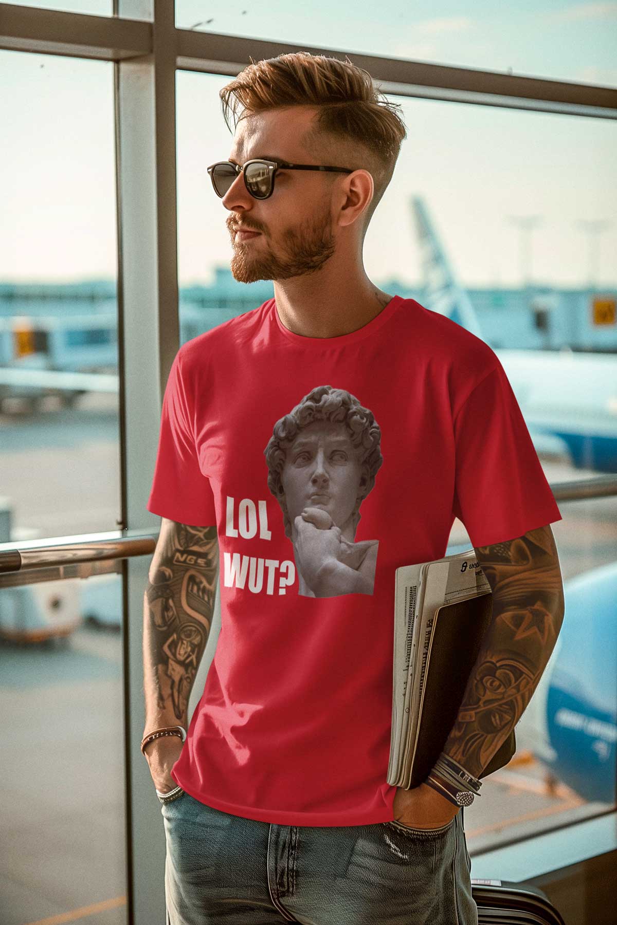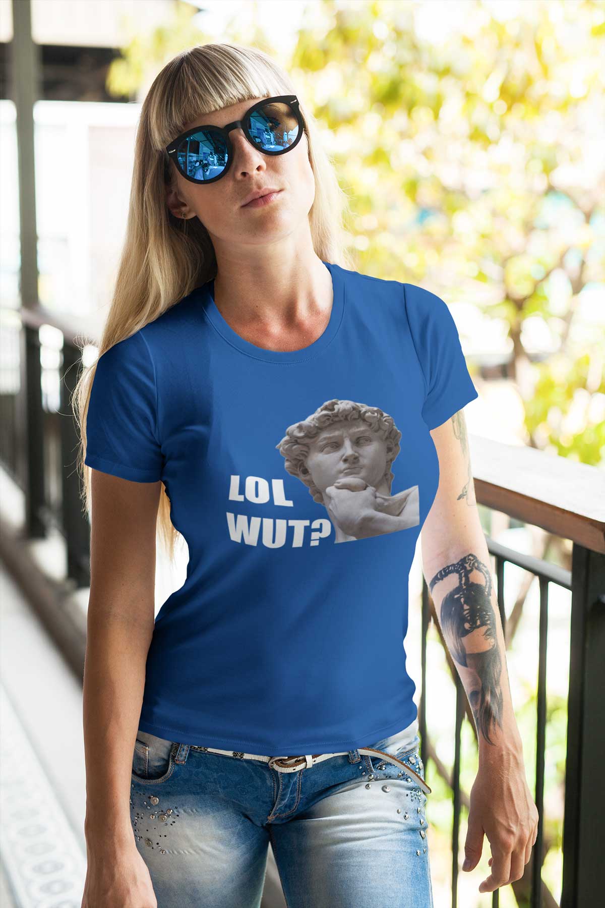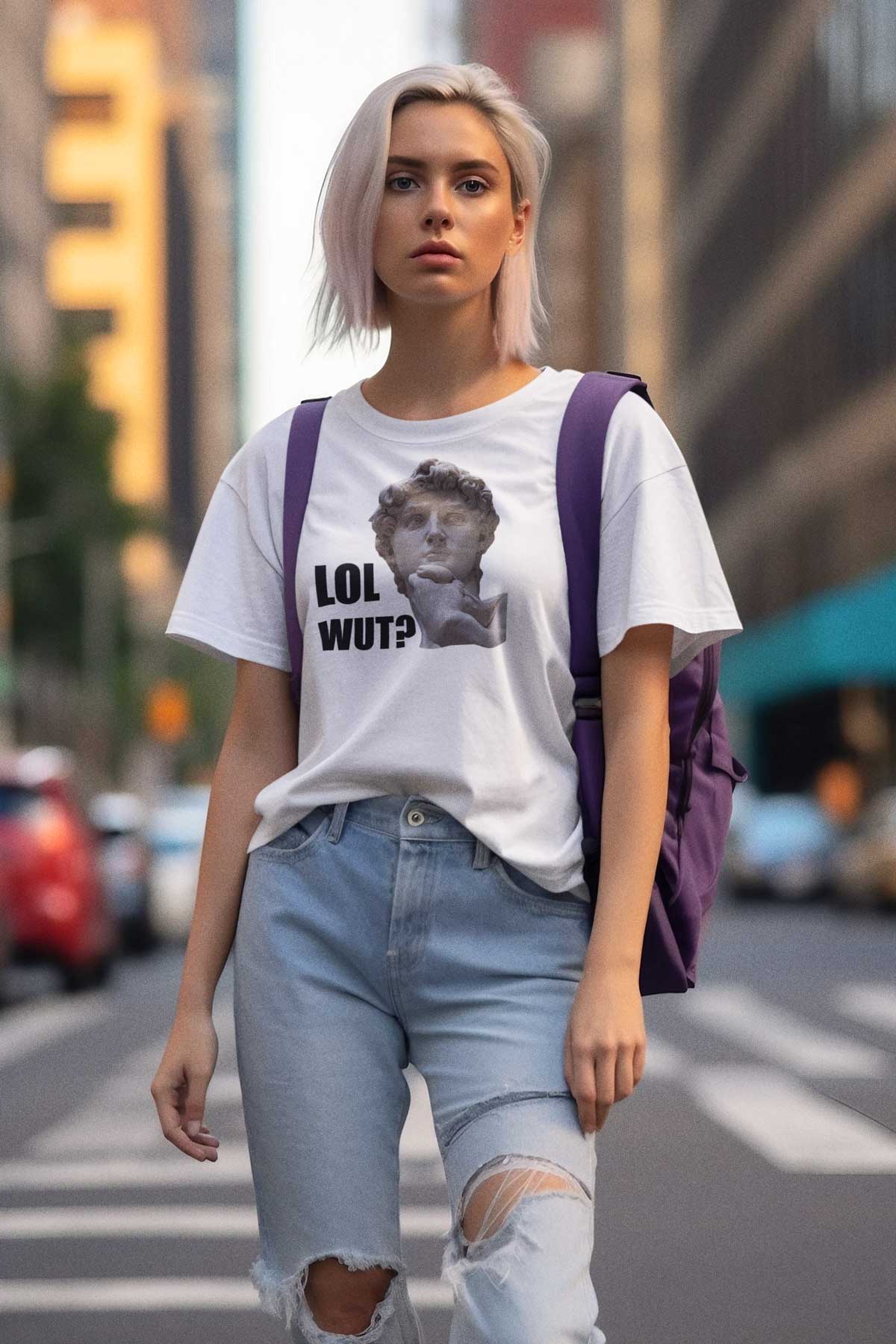 Introducing the T-shirt that’s got more sass than Michelangelo’s David on a Monday morning! Imagine the classic statue, chiseled and majestic, suddenly exclaiming, “LOL WUT?”—because even Renaissance masterpieces can’t believe some of the things they see nowadays!
